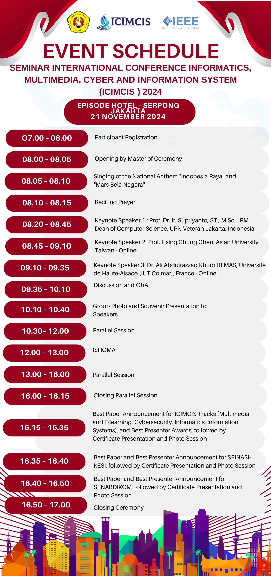 | 16.15 – 16.35 | Best Paper Announcement for ICIMCIS Tracks (Multimedia and E-learning, Cybersecurity, Informatics, Information Systems), and Best Presenter Awards, followed by Certificate Presentation and Photo Session |